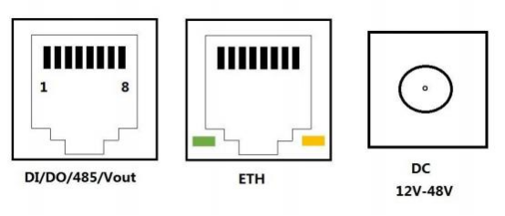 设备下方有3个接口: DI/ DO/485/Vout 接口、ETH 网络通讯接口、DC12V-48V。