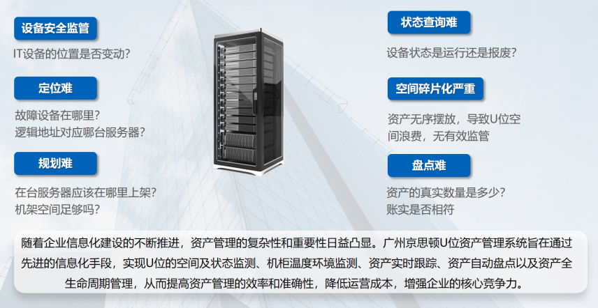 广州斯必得U位资产管理系统通过先进的技术手段和管理理念,实现了对U位空间和状态、机柜温度环境、资产实时跟踪、自动盘点以及全生命周期的全面管理。该系统的实施将有效提升企业的资产管理水平,降低运营成本,增强企业的竞争力。
